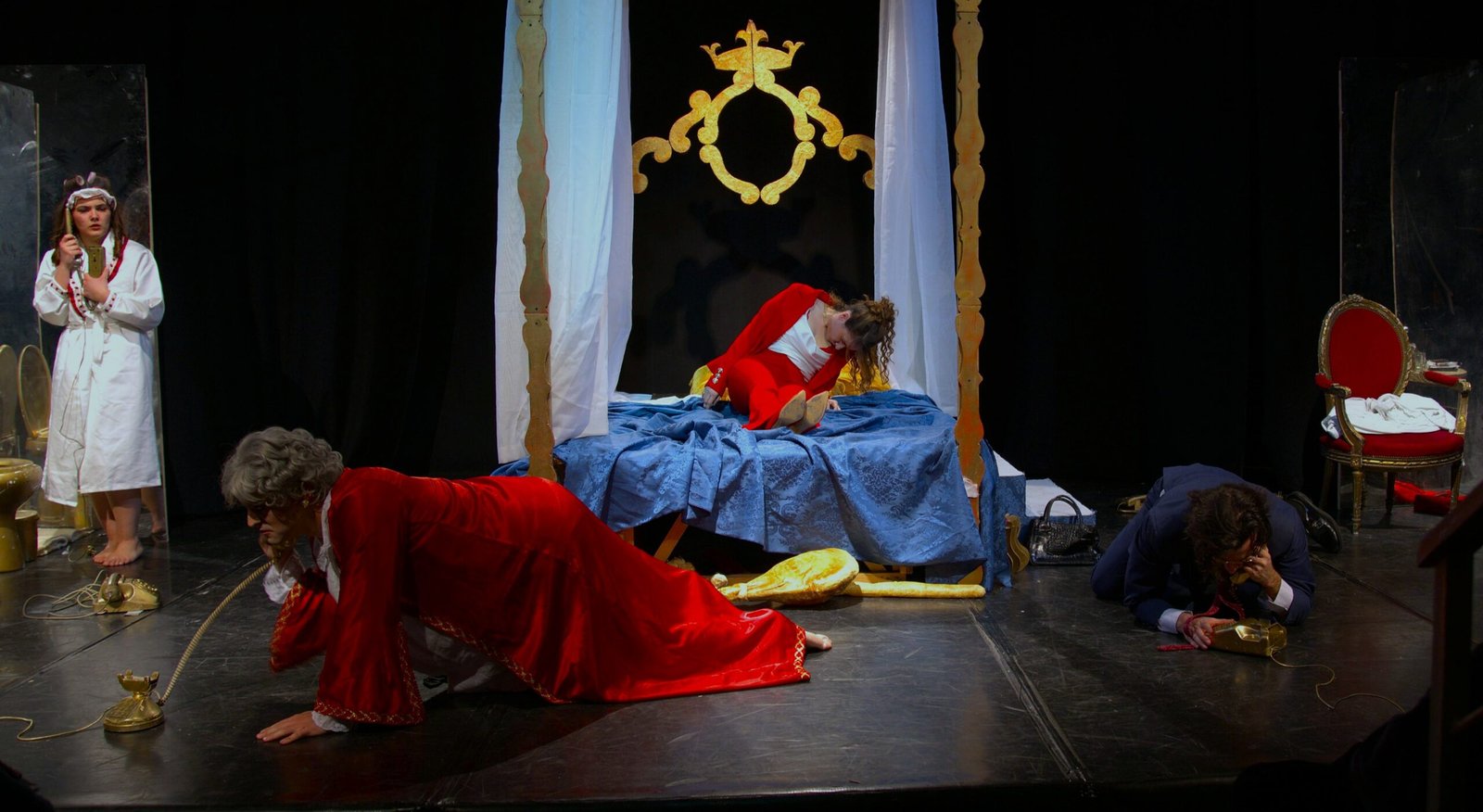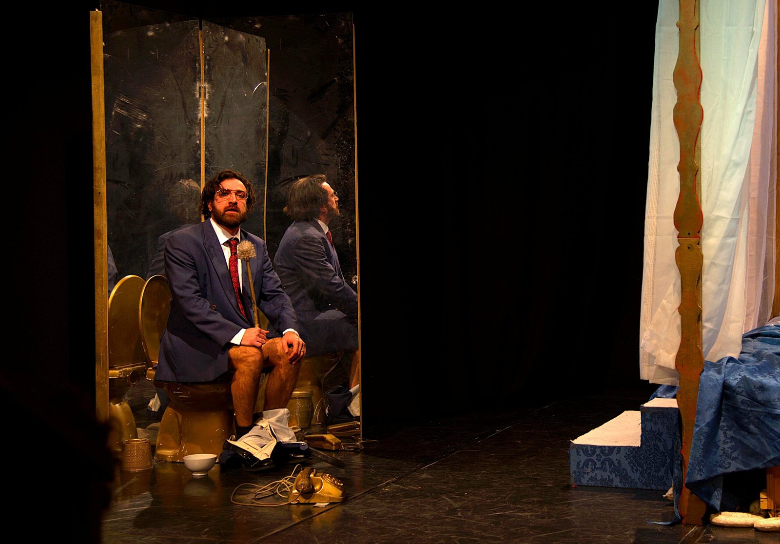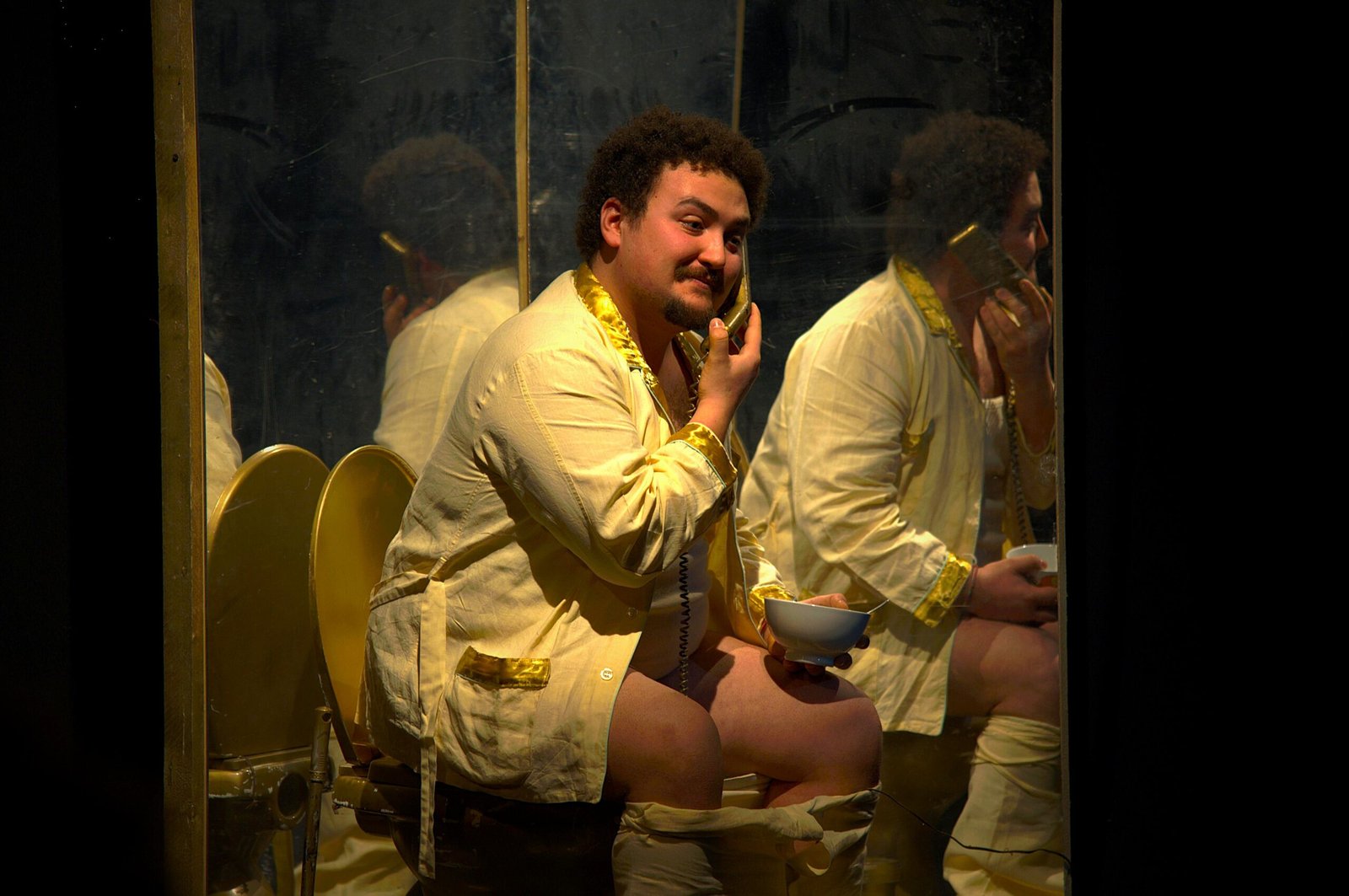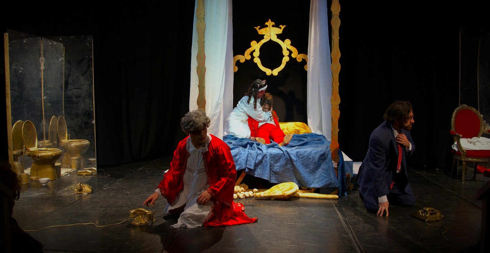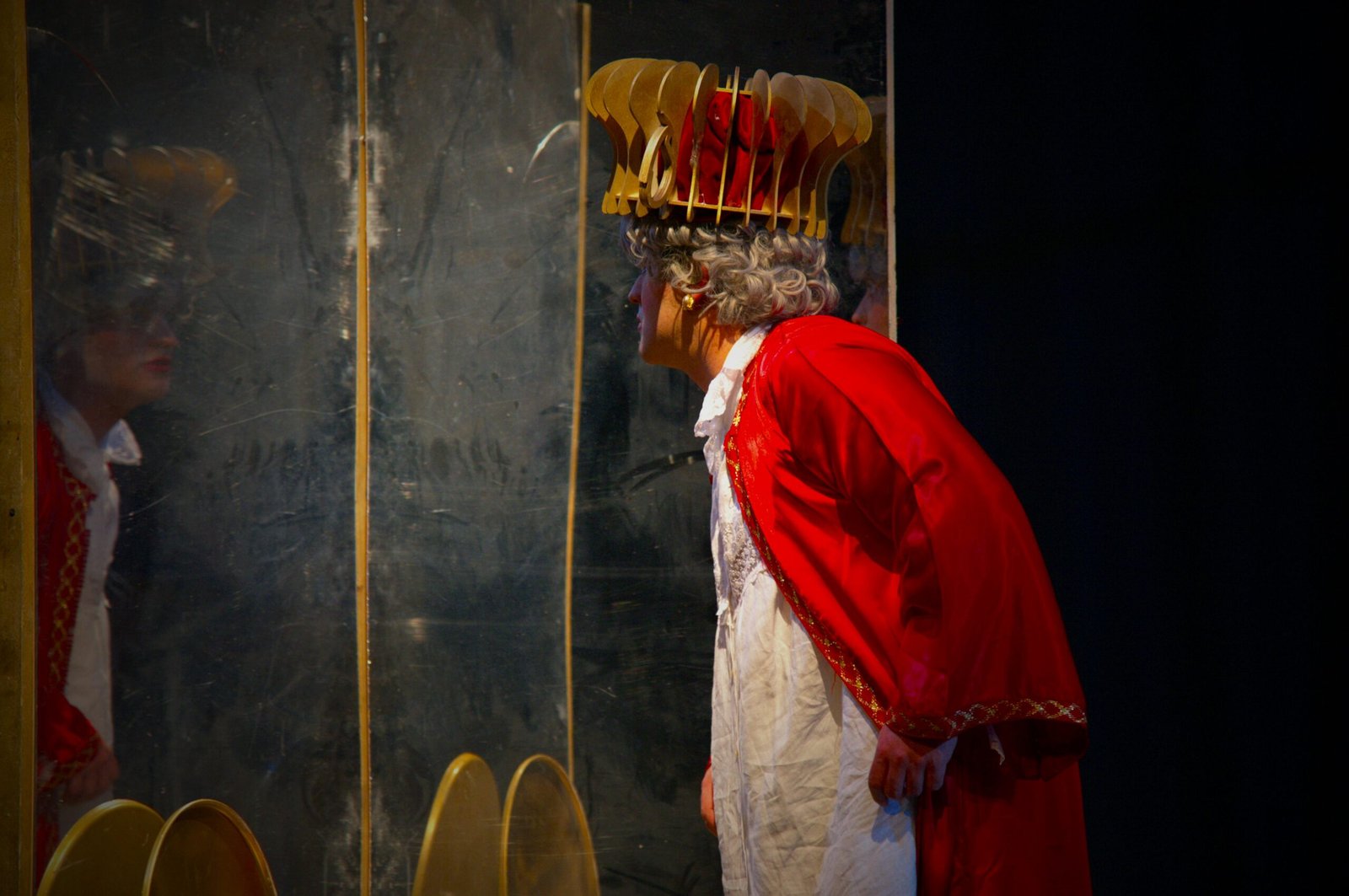 Questo meccanismo mi ha lasciato operare sul rapporto ambiguo di lotta e amore che ogni personaggio ha con la propria immagine – quello che appare e quello che è – tormentati dalla presenza scenica di specchi capaci di spiarli anche mentre sono in bagno. C’è un’ammirazione verso la vera immagine di sé, o rammarico? Resta in ogni modo sconfortante vedere come una Famiglia Reale – simbolo del potere assoluto – si preoccupi con esasperazione di studiare a tavolino come apparire, lasciandosi alle spalle ogni credo ed etica personale. Lo studio certosino di come apparire mi lasciava vedere questi personaggi intrappolati in dei piccoli palcoscenici, dietro sipari piccoli e leggeri che per quanto possano coprire, tradiscono la vera immagine di chi vi si ripara dietro. È il Teatro a rendersi, insomma, protagonista di questo spettacolo; il Teatro nelle sue forme poetiche e storiche, quasi a ricordare meccanismi colorati ed esasperati della grande tradizione della Commedia dell’Arte, e in una forma di ipocrisia sociale perniciosa che ricorda la vera finzione nella quale tutti siamo caduti!
