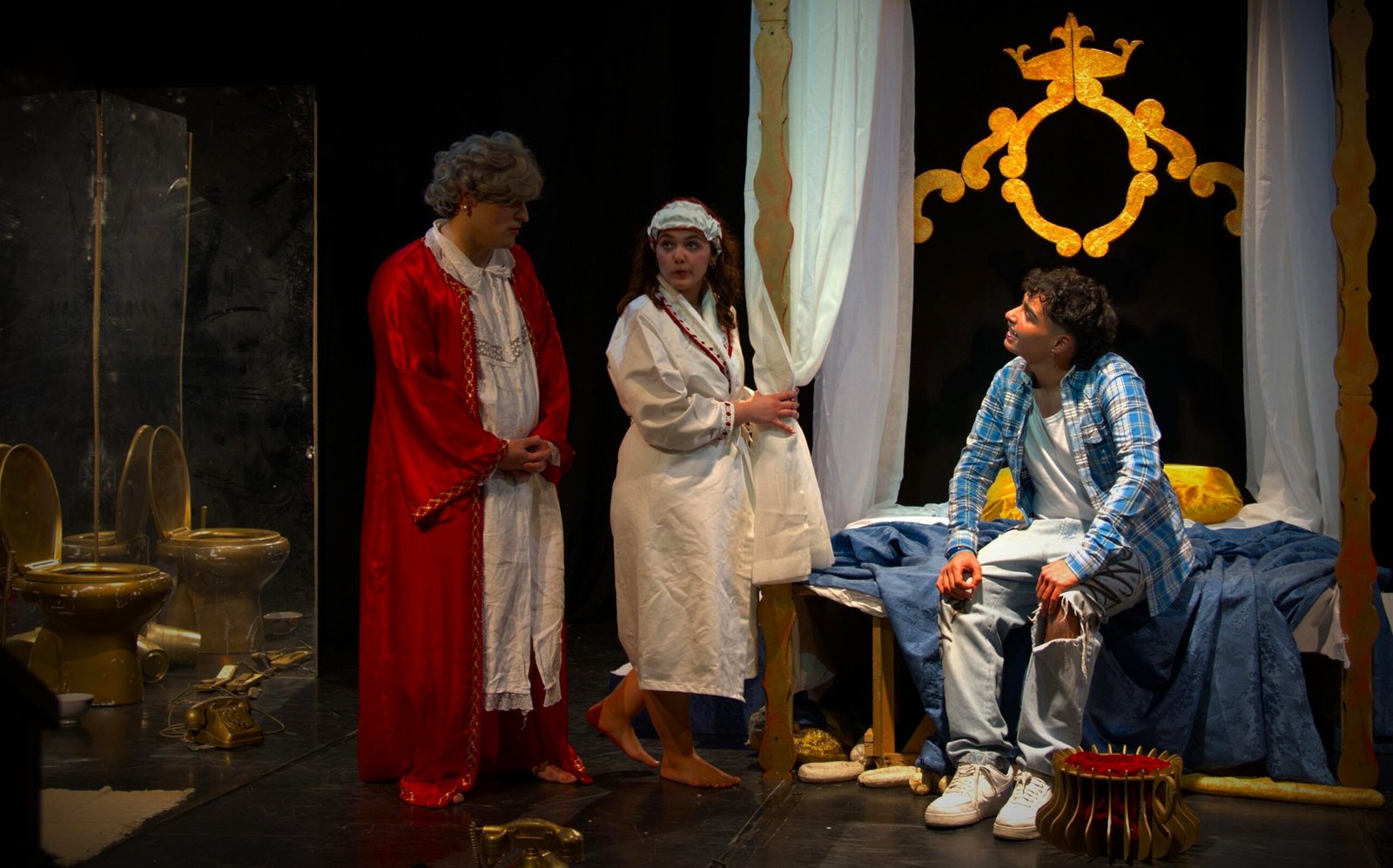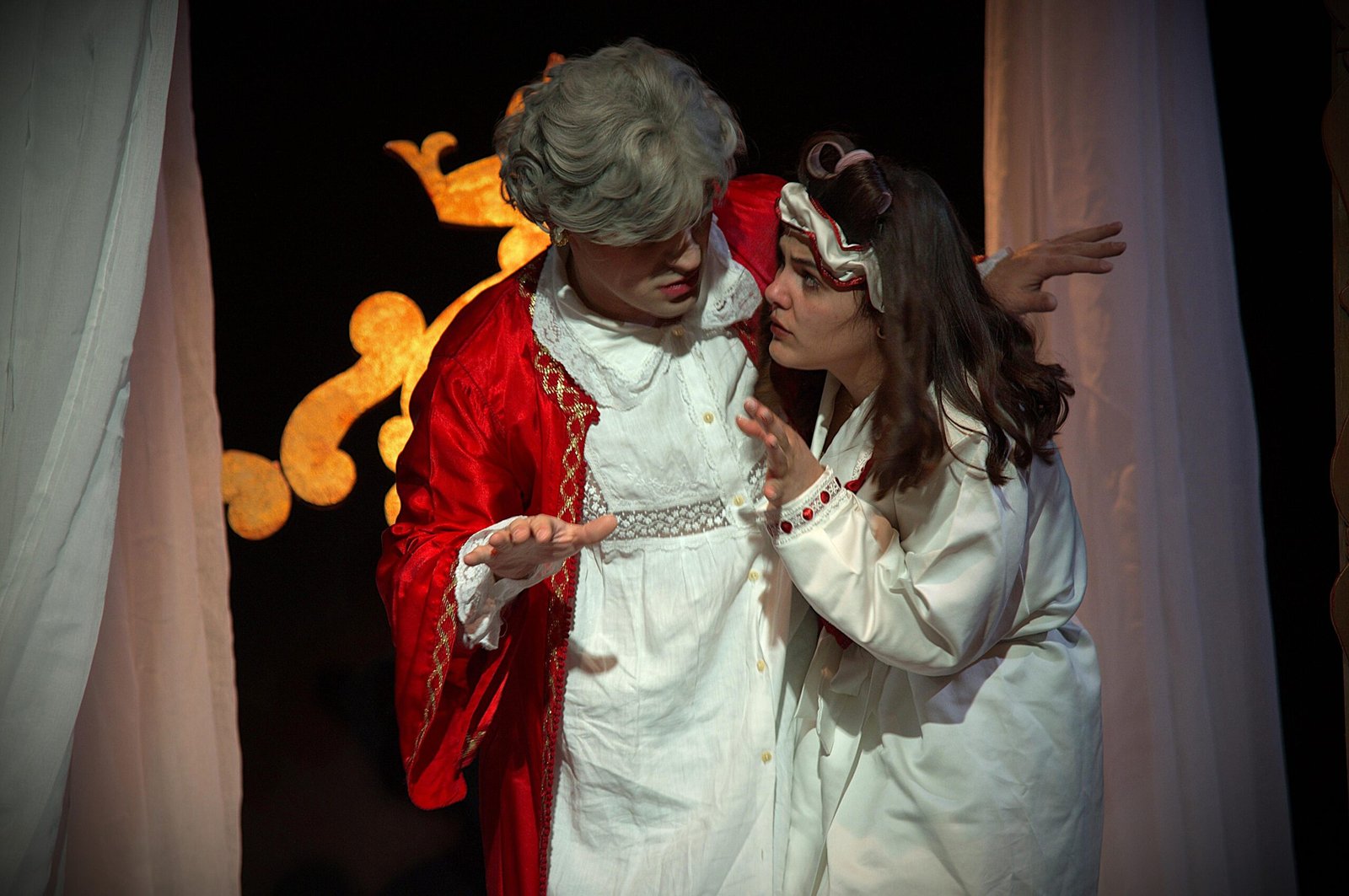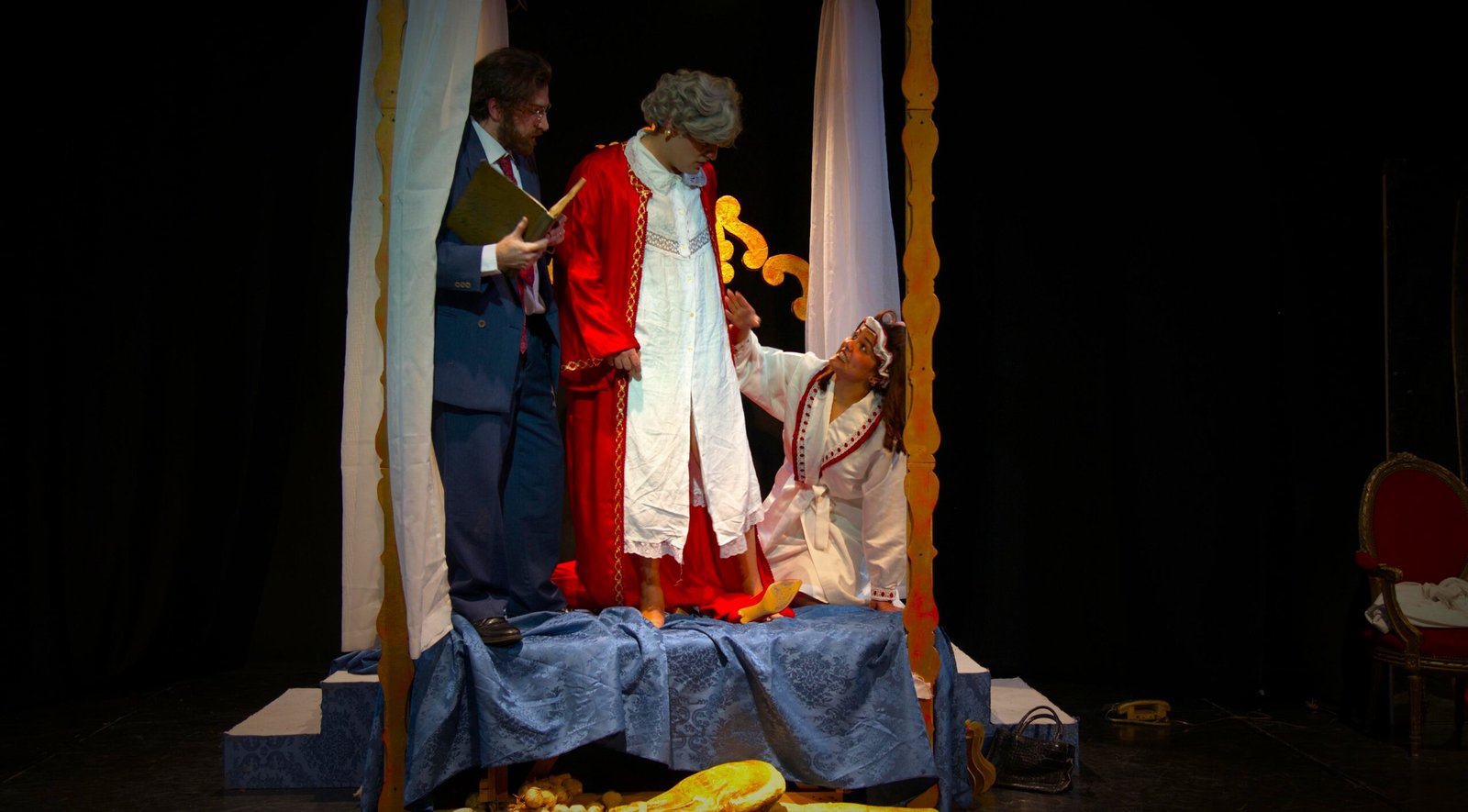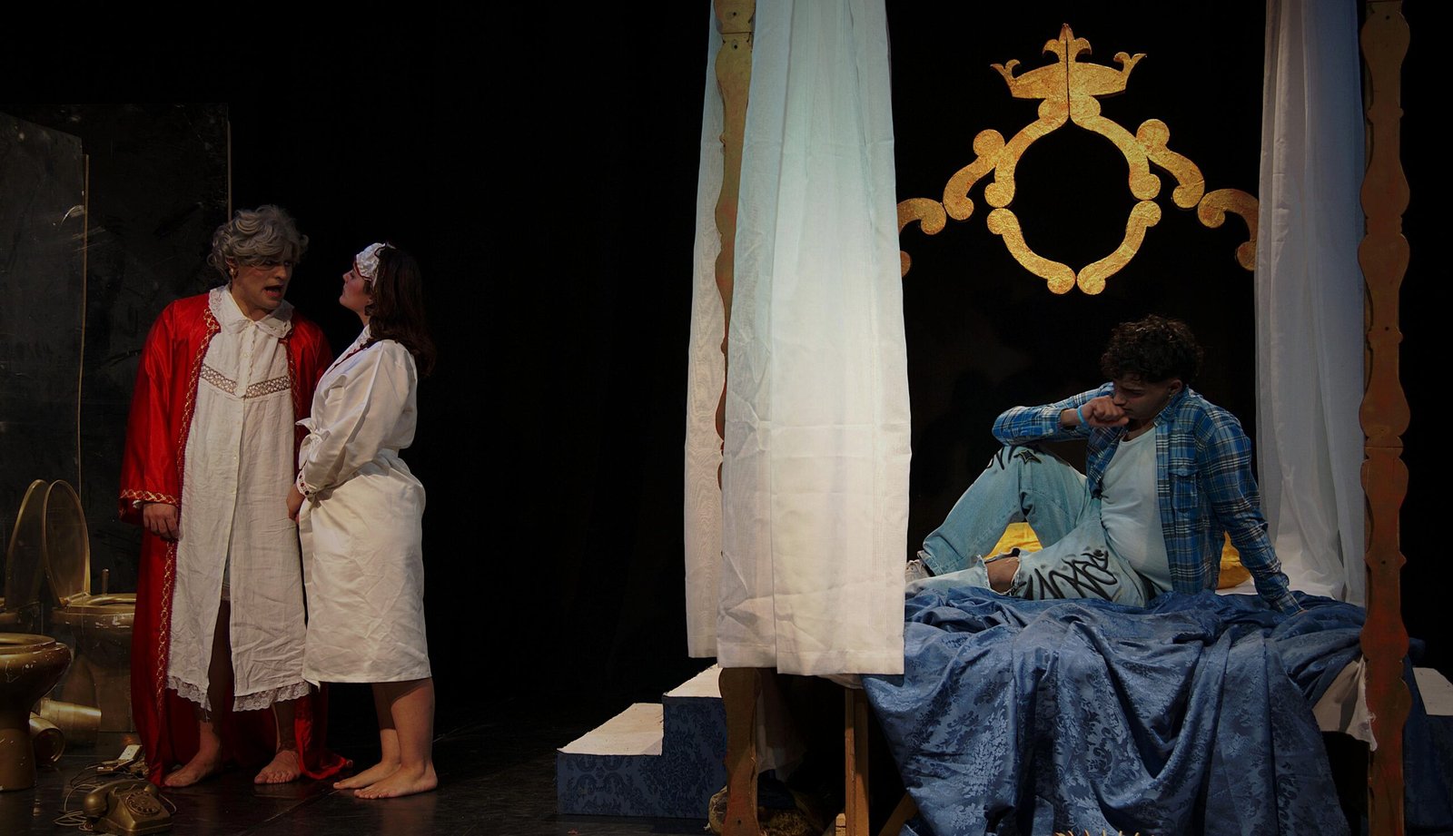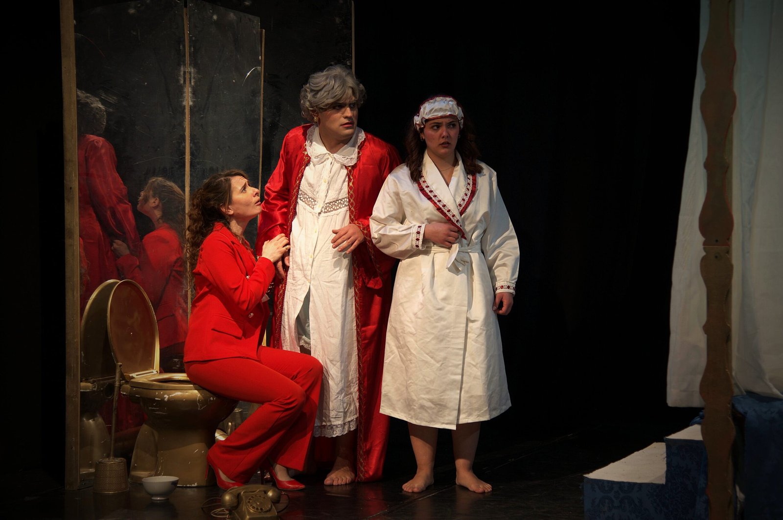 Questo meccanismo mi ha lasciato operare sul rapporto ambiguo di lotta e amore che ogni personaggio ha con la propria immagine – quello che appare e quello che è – tormentati dalla presenza scenica di specchi capaci di spiarli anche mentre sono in bagno. C’è un’ammirazione verso la vera immagine di sé, o rammarico? Resta in ogni modo sconfortante vedere come una Famiglia Reale – simbolo del potere assoluto – si preoccupi con esasperazione di studiare a tavolino come apparire, lasciandosi alle spalle ogni credo ed etica personale. Lo studio certosino di come apparire mi lasciava vedere questi personaggi intrappolati in dei piccoli palcoscenici, dietro sipari piccoli e leggeri che per quanto possano coprire, tradiscono la vera immagine di chi vi si ripara dietro. È il Teatro a rendersi, insomma, protagonista di questo spettacolo; il Teatro nelle sue forme poetiche e storiche, quasi a ricordare meccanismi colorati ed esasperati della grande tradizione della Commedia dell’Arte, e in una forma di ipocrisia sociale perniciosa che ricorda la vera finzione nella quale tutti siamo caduti!